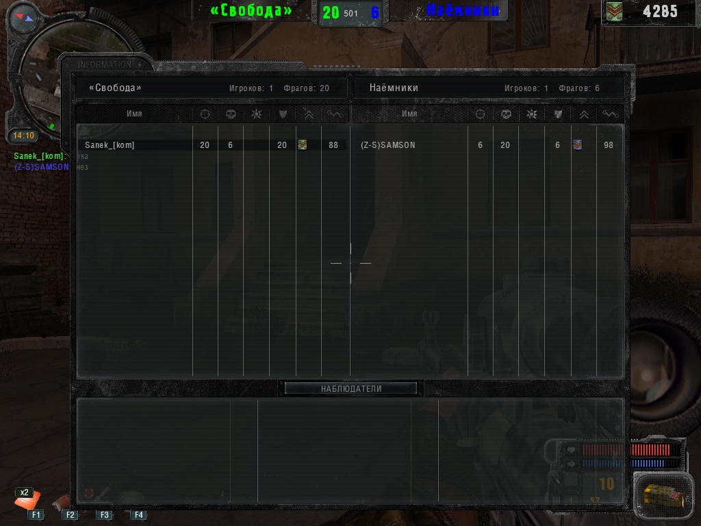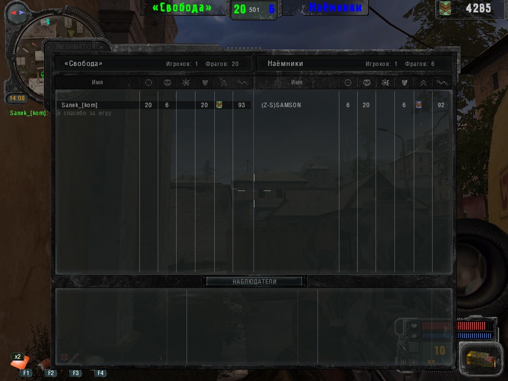 Сыграна дуэль с бойцом SAMSON из клана (Z-S). Карта была "Пожарная станция", играли мы до 20-фрагов. Sanek_[kom] - то есть я выиграл)) Скришоты смотрите ниже.